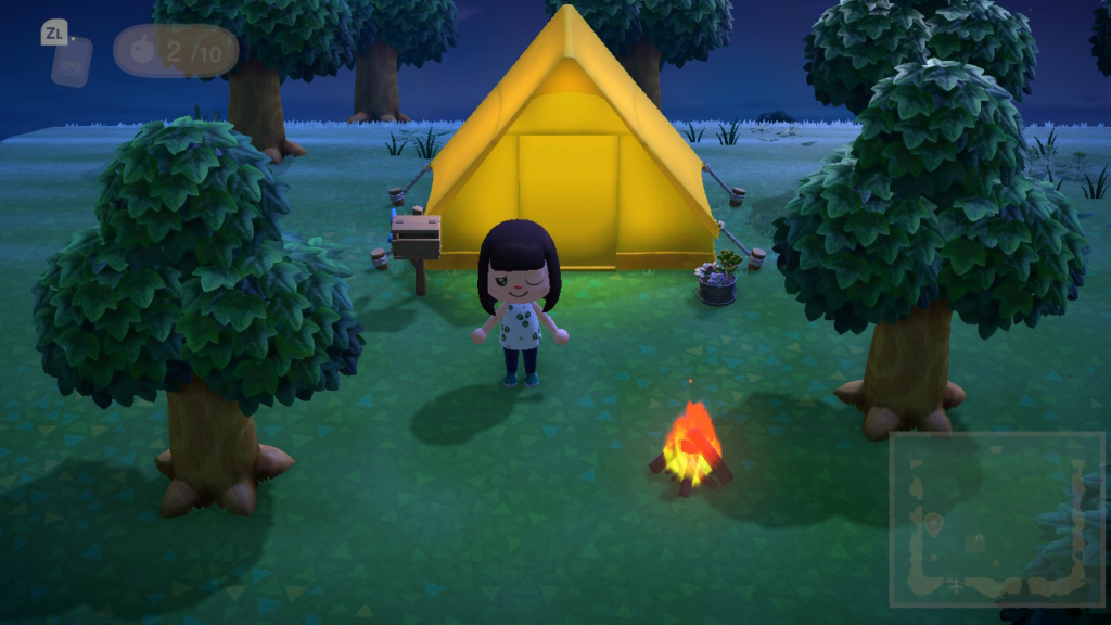 夜のテントの前で、焚火のそばに立っているこの姿。